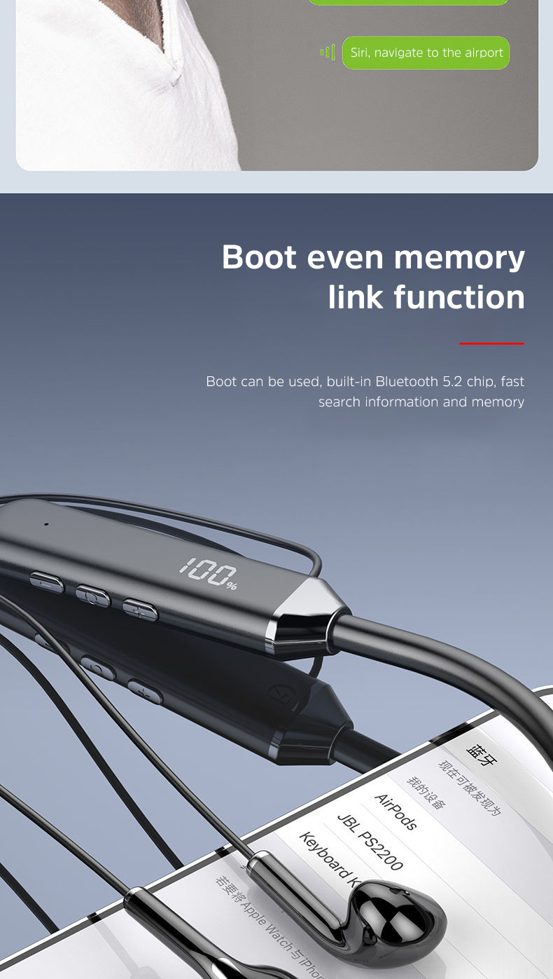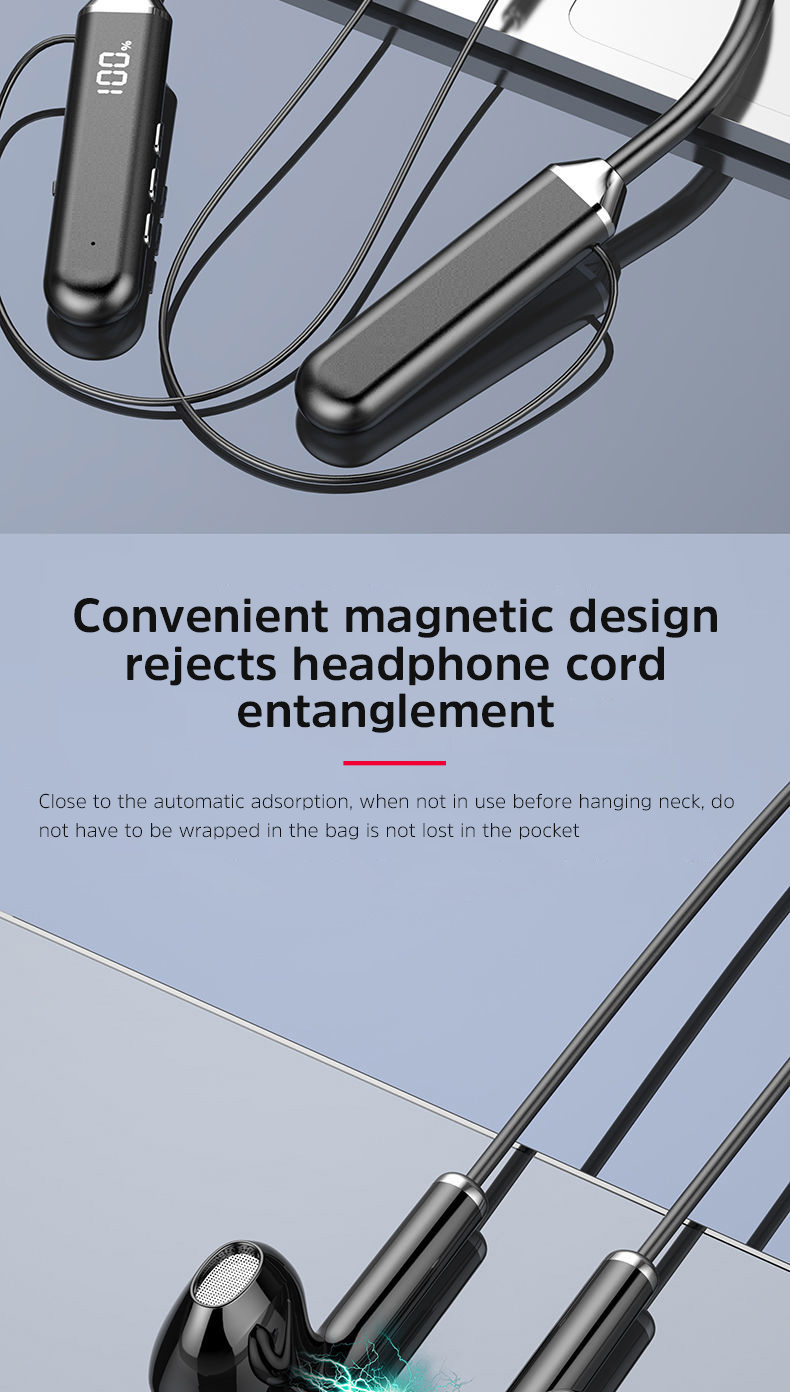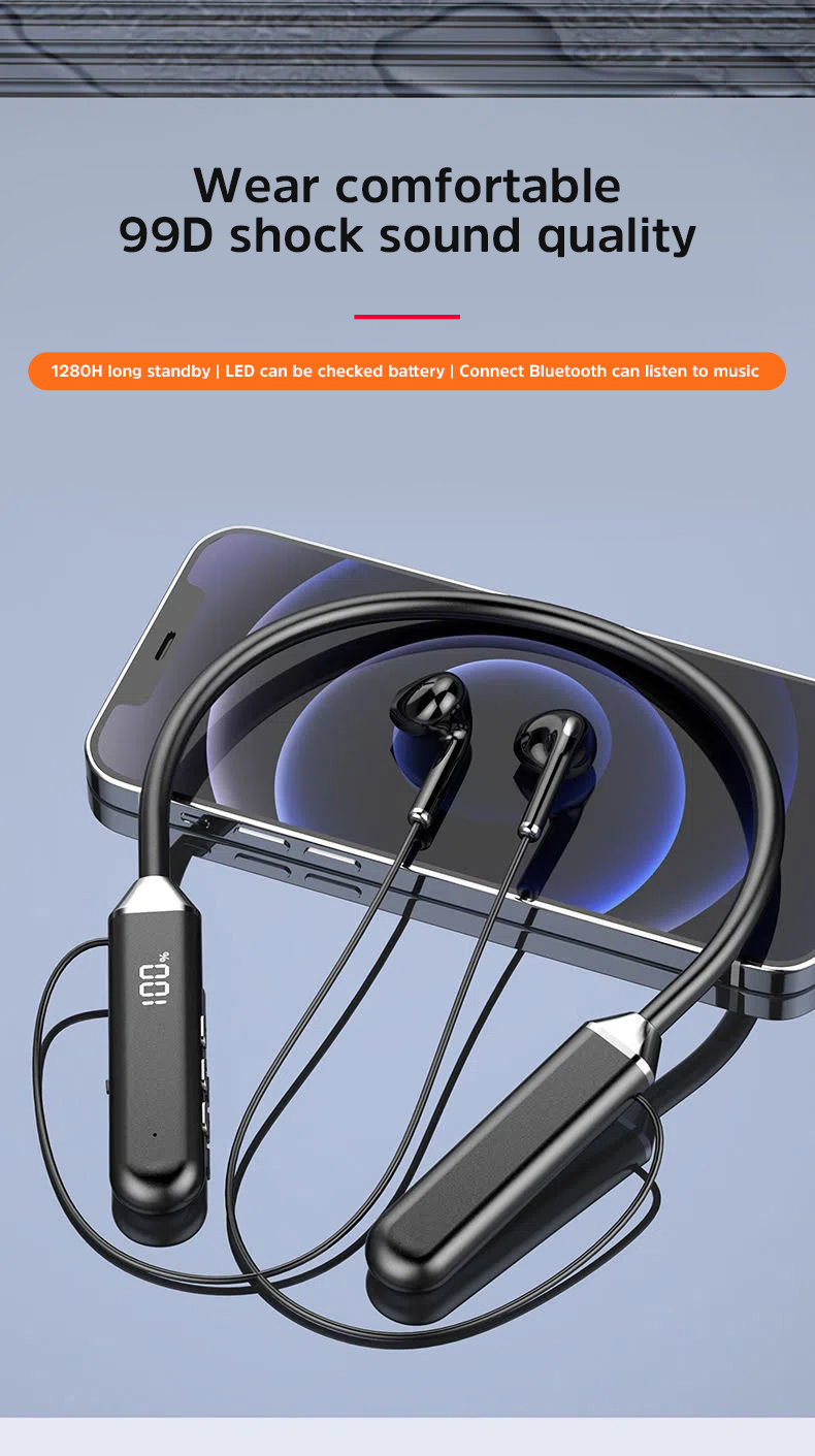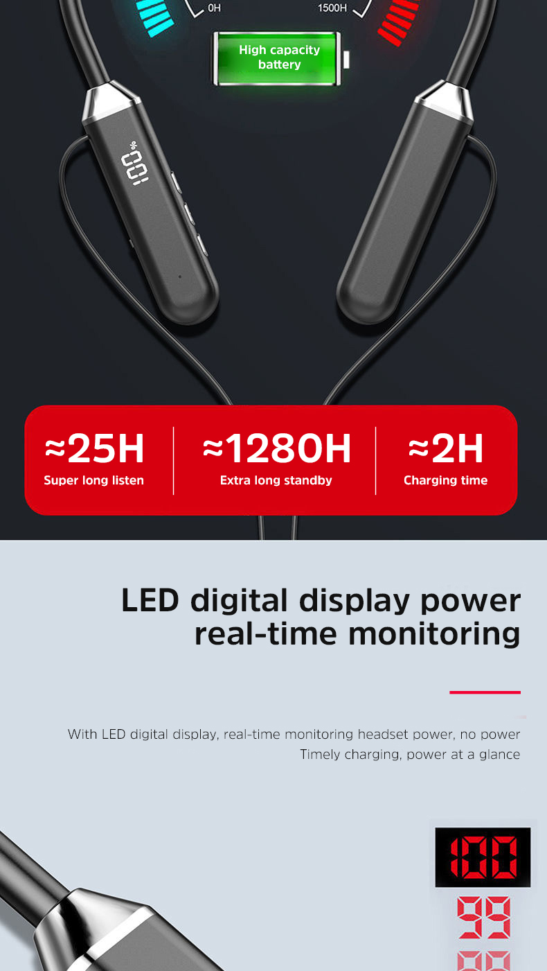 Upgraded Neckband Bluetooth Headphones feature the latest Bluetooth 5.3 technology for faster and more stable connections, with an ultra-long standby time of 1888 hours and 25 hours of continuous playback. Enjoy cinema-grade HiFi sound quality with deep bass for an immersive audio experience. The IP54 sweatproof design ensures durability during intense workouts, while the secure fit keeps them in place no matter how vigorous your movements. The LED display shows real-time battery status, and the magnetic earbuds prevent tangling and loss. These headphones are made from lightweight, skin-friendly materials and offer a comfortable and stable fit. Perfect for sports, commuting, gaming, and more—experience wireless freedom anytime, anywhere!